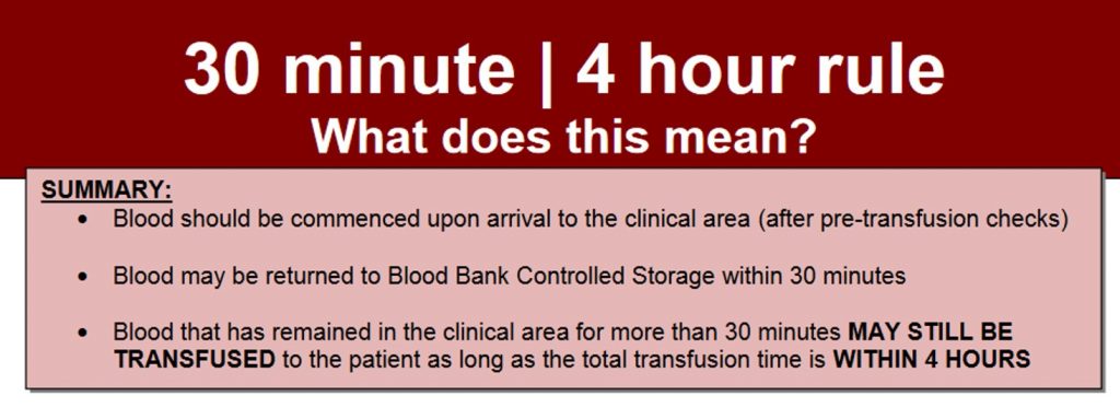 Berkaitan dengan kantong darah yang dibiarkan pada suhu ruang berlaku aturan 4 jam. Kantong darah yang sudah keluar dari pendingin dan dipindah kan ke ruangan, contohnya diletakkan di meja atau tergantung di tiang infus, masih bisa ditransfusikan ke pasien dengan catatan total waktu transfusi adalah 4 jam. Total waktu transfusi dihitung dari kantong darah keluar dari penyimpanan sampai darah habis. Transfusi satu kantong darah PRC tidak boleh melebihi batas waktu 4 jam karena resiko perkembangbiakan bakteri meningkat drastis pada suhu ruang, sehingga bisa memicu terjadinya infeksi bakterial pada pasien.