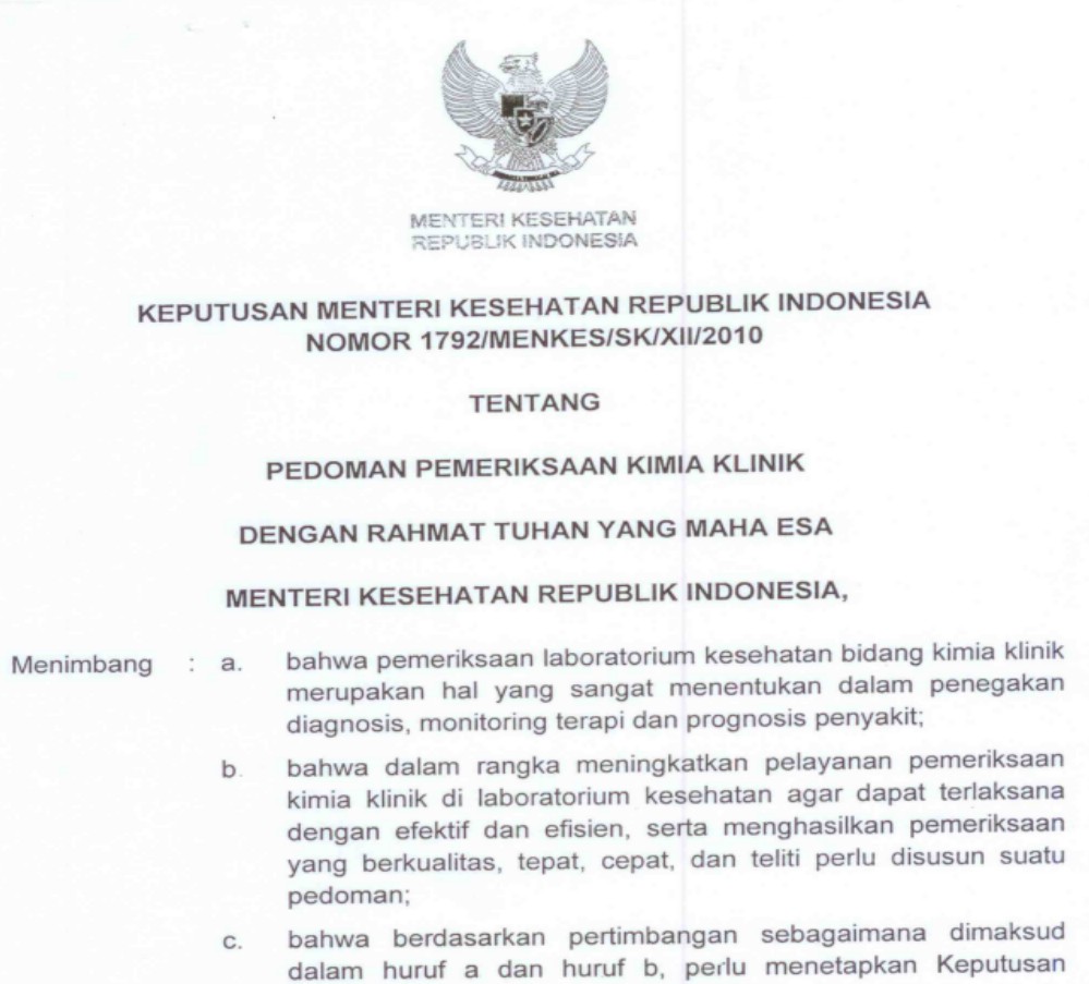 Pedoman ini membahas pemeriksaan kimia klinik yang umum diperiksa di laboratorium kesehatan, dan spesimen yang dibahas dibatasi pada spesimen darah manusia.