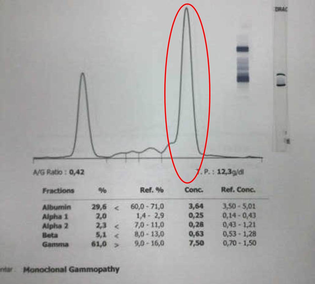 Salah satu contohnya dapat dilihat dari salah satu pasien ini. Dari pemeriksaan kimia darah diketahui kadar total protein 12,3 g/dl (N=6-8,5 g/dl), albumin 3,64 g/dl (N=3,5-5,5), dan globulin 8,66 g/dl (2,5-4,5 g/dl). Dapat kita lihat bahwa terjadi peningkatan kadar globulin yang sangat signifikan. Untuk mengetahui adanya protein monoclonal, kita lakukan elektroforesis protein. Hasilnya dapat kita lihat terdapat gambaran spike pada fraksi gamma globulin seperti gambar di bawah ini. Gambaran ini merupakan ciri khas dari MM. Dengan melihat klinis pasien, hasil lab yang lain, dan pemeriksaan aspirasi sumsum tulang, diagnosisnya telah ditegakkan MM.