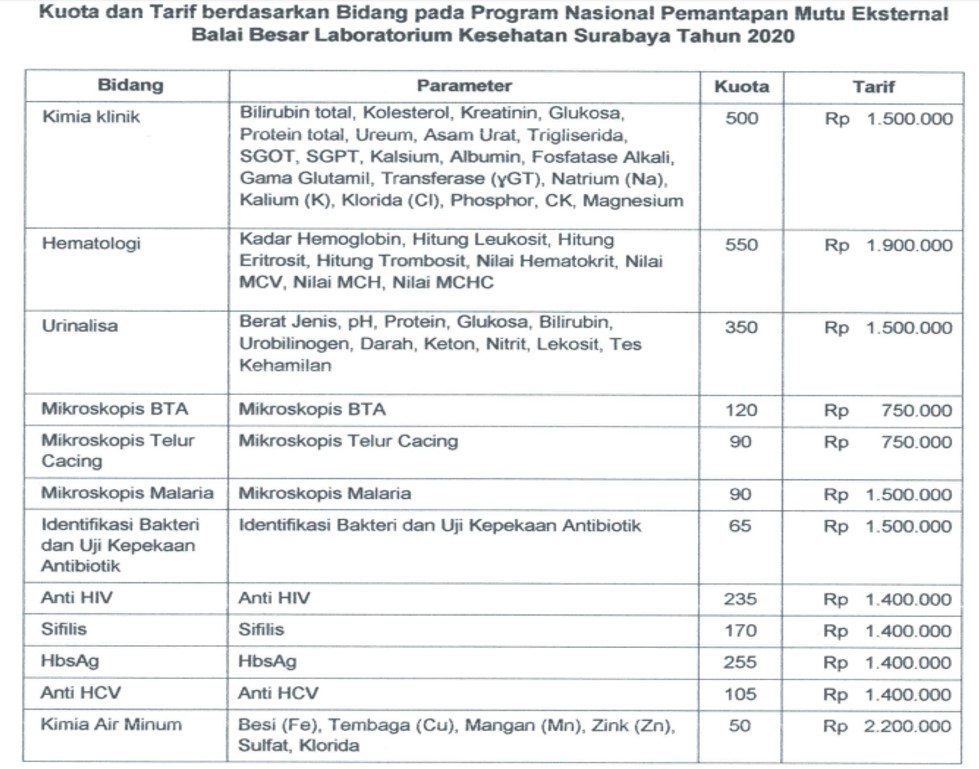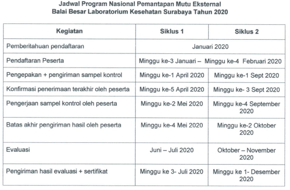 Sehubungan Balai Besar Laboratorium Kesehatan Surabaya akan menyelenggarakan Program Nasional Pemantapan Mutu Eksternal (PNPME) tahun 2020, maka kami mengundang Saudara untuk ikut serta dalam PNPME yang direncanakan sekitar bulan April 2020 (siklus I) dan sekitar bulan September 2020 (Siklus II).