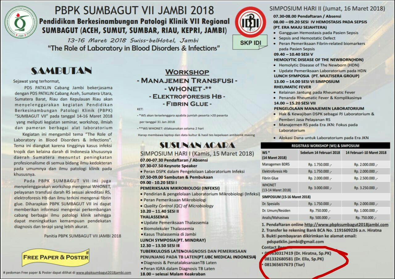PDS PATKLIN Cabang Jambi bekerjasama dengan PDS PATKLIN Cabang Aceh, Sumatra Utara, Sumatera Barat, Riau dan Kepulauan Riau akan menyelenggarakan kegiatan Pendidikan Berkesinambungan Patologi Klinik (PBPK) “SUMBAGUT VII” pada tanggal 14-16 Maret 2018 yang meliputi kegiatan Seminar, Workshop dan Pameran berbagai alat laboratorium.