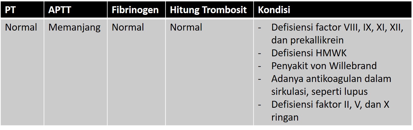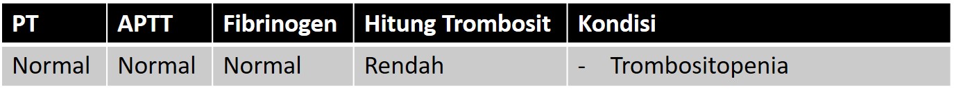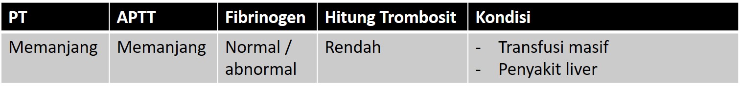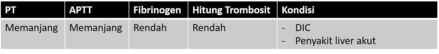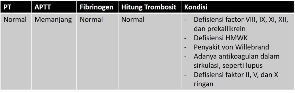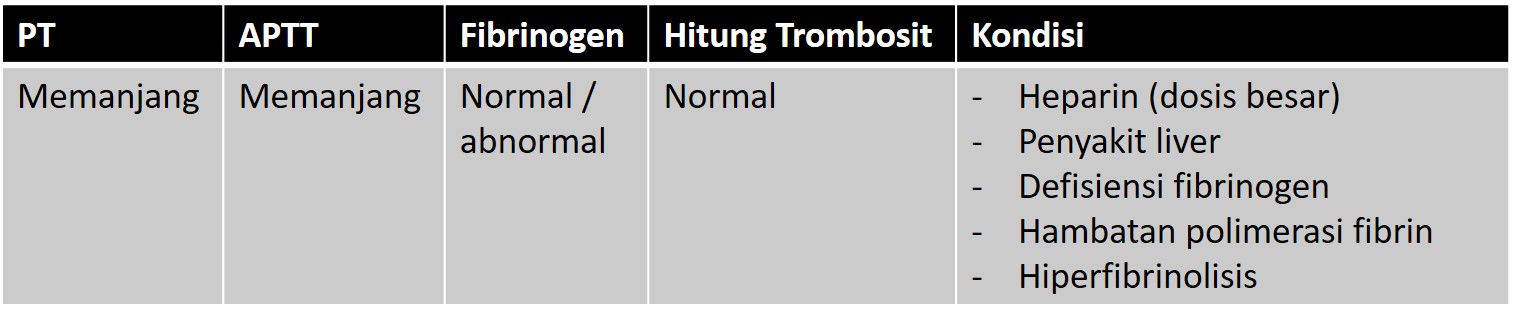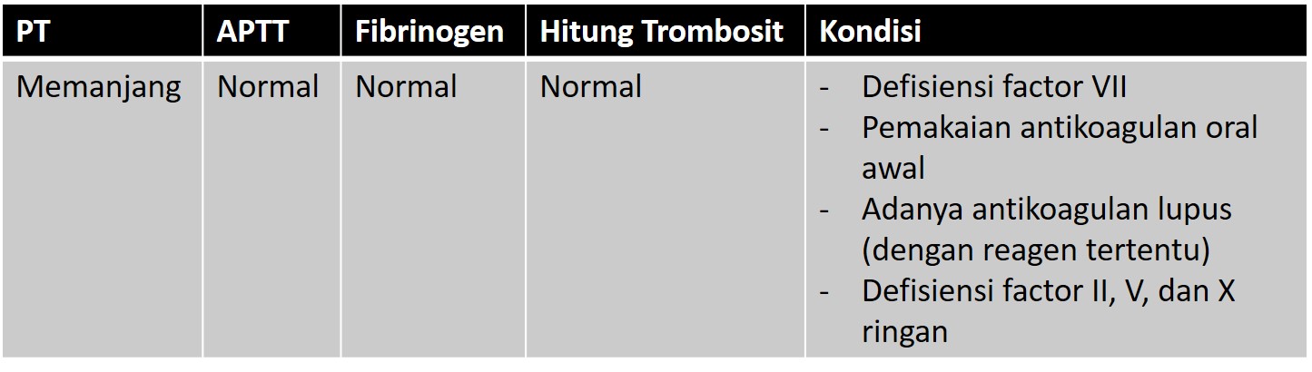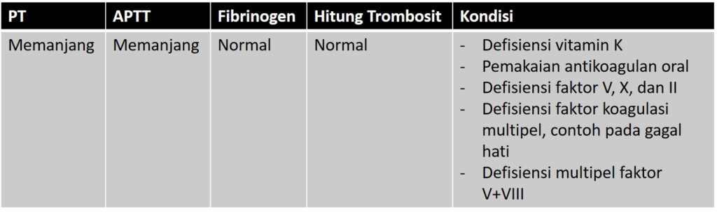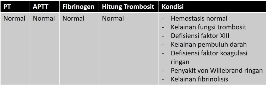 Berikut berbagai kemungkinan penyebab adanya kelainan pada hasil pemeriksaan hemostasis: