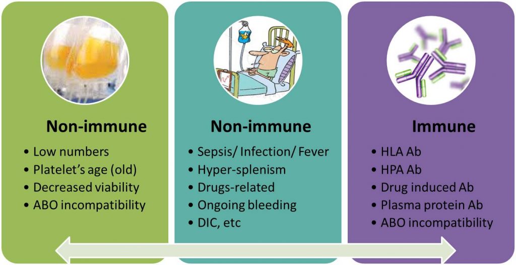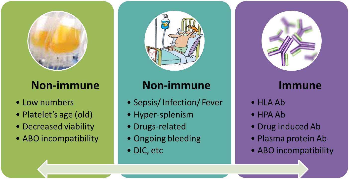 Kegagalan mencapai target peningkatan jumlah trombosit yang ditunjukkan dengan nilai CCI (<7,5 1 jam post transfusi atau <4,5 24 jam post transfusi) pada dua kali transfusi secara berturutan disebut juga platelet refractoriness. Platelet refractoriness bisa disebabkan oleh mekanisme imun dan non imun. Mekanisme imun disebabkan oleh adanya antibodi terhadap HLA, antibodi terhadap trombosit, dan inkompatibilitas ABO, sedangkan non imun disebabkan oleh adanya demam, infeksi, sepsis, DIC, splenomegali, obat-obatan, dan perdarahan yang sedang berlangsung.