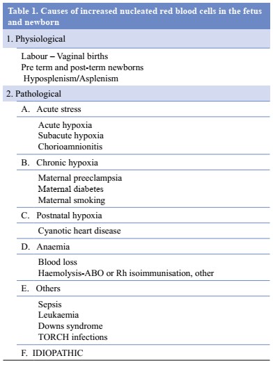 Berbagai penyebab normoblastemia patologis pada neonatus dan bayi dapat dilihat pada tabel di atas, di antaranya oleh karena hipoksia, anemia, dan penyebab lainnya. Sekitar 8-15 normoblas per 100 leukosit dapat ditemukan pada kondisi hipoksia kronis, sedangkan pada kondisi hipoksia akut dan hipoksia akibat kelainan jantung kongenital jumlah normoblas bisa ditemukan lebih dari 2.000/mm3. Hal ini disebabkan oleh peningkatan produksi eritroipoietin akibat hipoksia jaringan yang memicu stimulasi eritropoiesis.