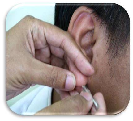 - Disinfeksi cuping telinga dengan kapas alkohol 70% dan tunggu kering