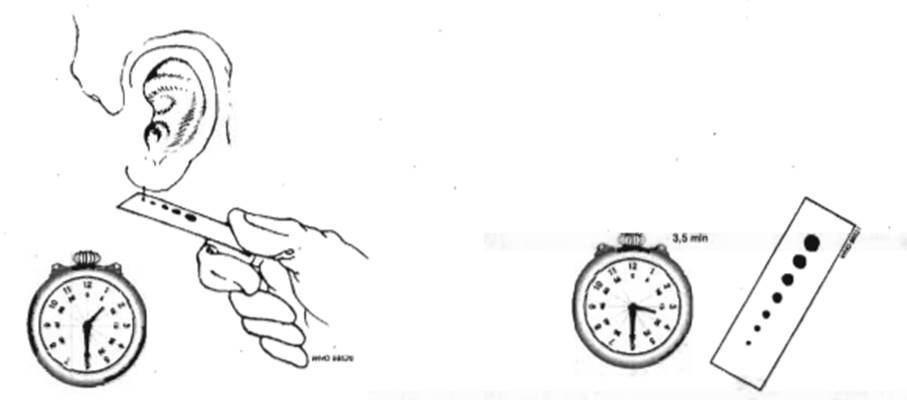 - Kalau darah tidak keluar, stopwatch dihentikan. Catat waktu yang ditunjukkan pada stopwatch, atau hitung banyaknya tetesan darah pada kertas saring, lalu kali 30 detik.