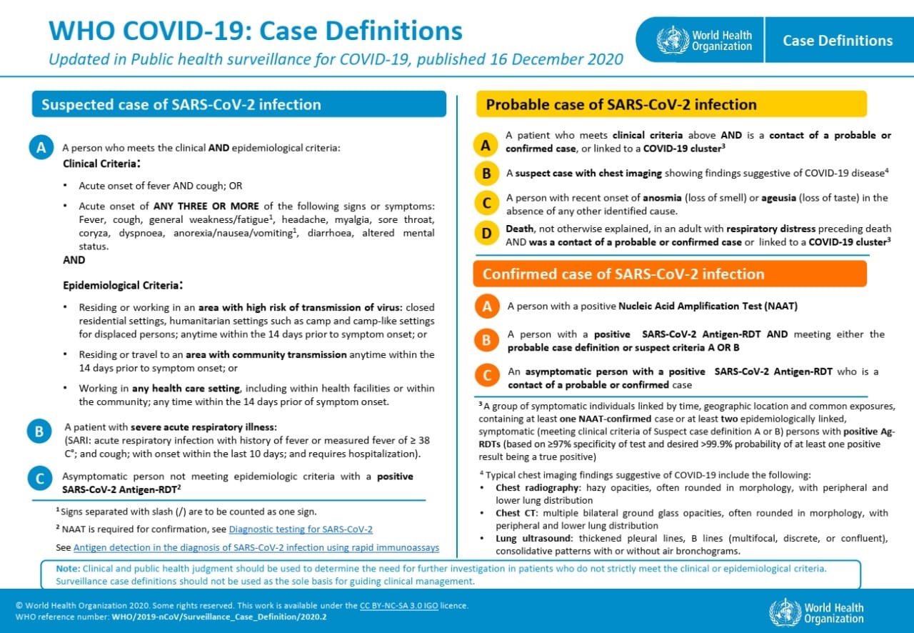 Definisi kasus terbaru dari WHO (per 16 Desember 2020) dan menurut Pedoman Tatalaksana Covid-19 Edisi-3 (per Desember 2020), telah memasukkan penggunaan rapid antigen SARS-CoV-2 dalam diagnosis COVID-19. Rekomendasi WHO terkait penggunaan rapid antigen ini sebagai berikut: