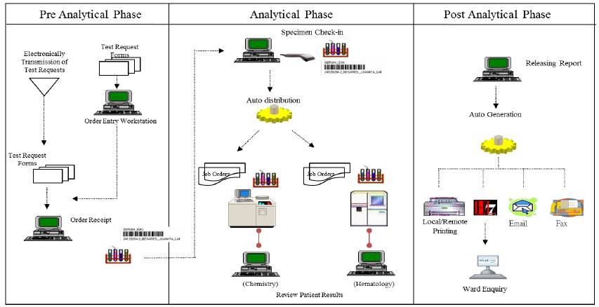 - Proses Perencanaan: data dari sistem informasi laboratorium dapat digunakan sebagai dasar dalam merencanakan operasional laboratorium dalam jangka pendek dan jangka panjang, contohnya jumlah pemesanan reagen untuk selanjutnya, rencana penambaham item pemeriksaan, dan rencana pelatihan SDM laboratorium.