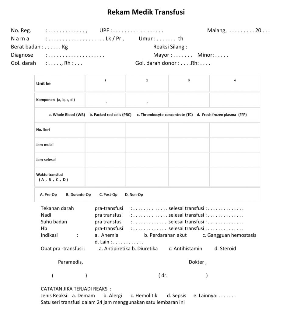 Contoh Rekam Medis Transfusi - Dalam 30 menit darah donor keluar dari lemari pendingin bank darah, transfusi harus sudah dilaksanakan.
