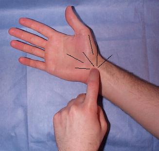 Dilakukan dengan cara menekuk kedua pergelangan tangan seperti di gambar. Kedua pergelangan saling ditekan secara gentle. Curigai bila terasa nyeri atau kebas yang menjalar.