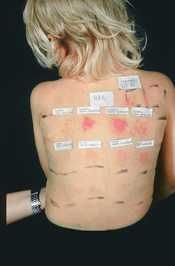Tes ini untuk mengetahui alergi kontak terhadap bahan kimia, misalnya pada penyakit dermatitis atau eksim dengan cara menempelkan patch pada daerah punggung. Hasilnya baru dapat dibaca setelah 48 jam. Bila positif akan timbul bercak merah dan melenting pada kulit.