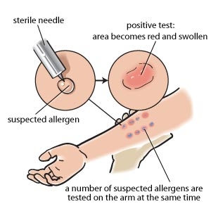 Tes ini bertujuan untuk memeriksa sensitivitas terhadap allergen hirup dan makanan, misalnya debu, bulu binatang, udang, dan lainnya. Caranya dengan menusukkan jarum khusus (panjang sekitar 2mm) yang telah berisi allergen pada kulit lengan bawah sisi bagian dalam. Hasilnya dapat diketahui dalam waktu 30 menit. Bila positif akan timbul bentol merah gatal.